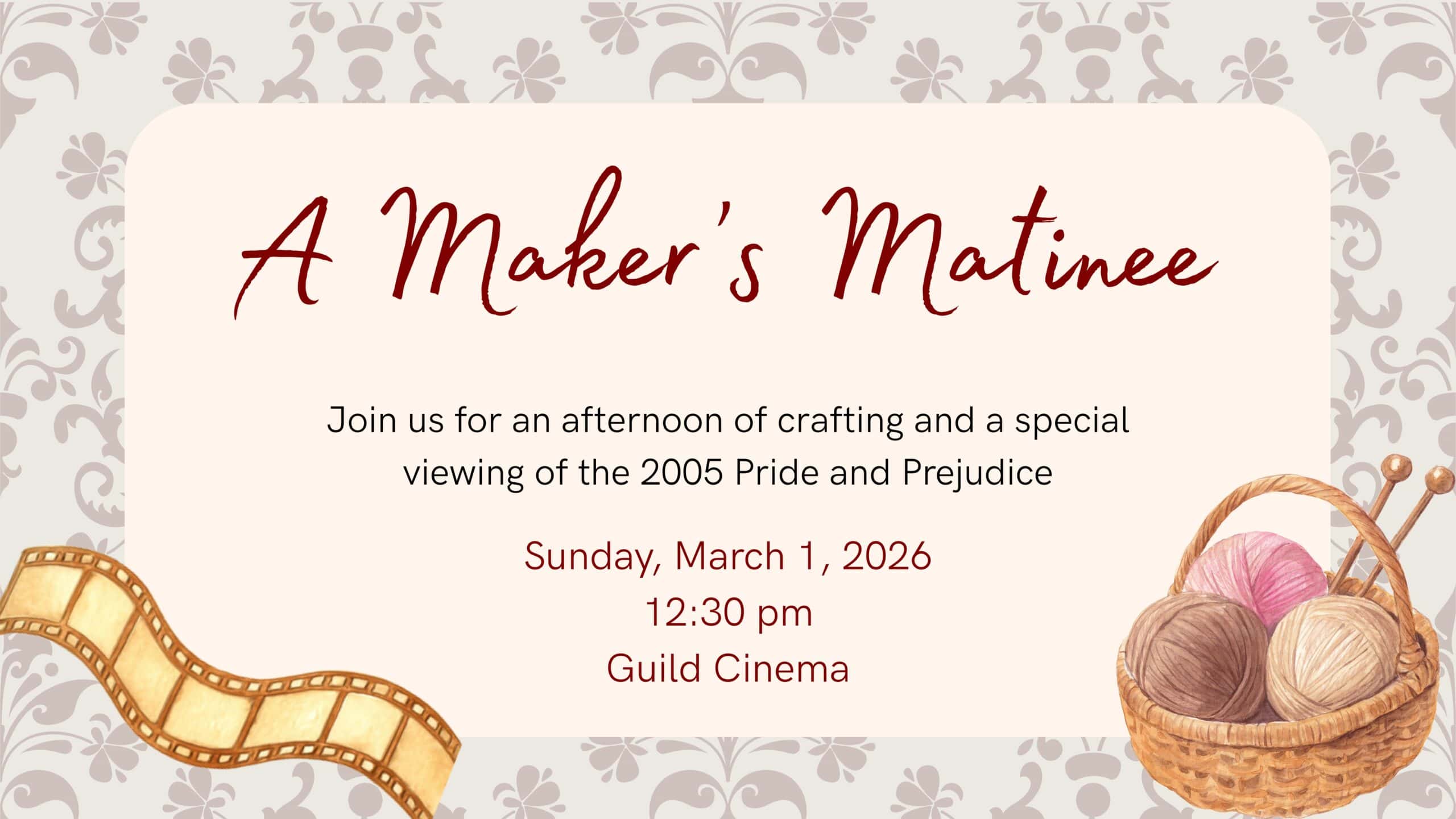 Lights will be dimmed low enough to watch the movie and bright enough to work on whatever projects you’d like to bring. Grab your yarns, looms, and needles — we welcome you to bring whatever will fit in your seat!